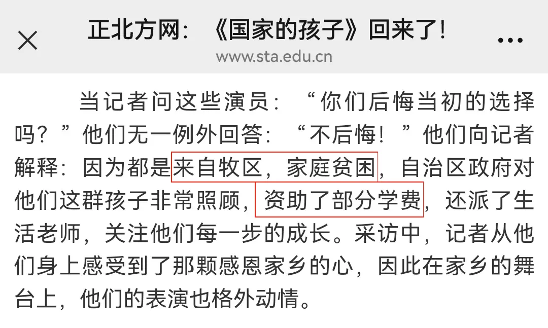 這篇報道説,這些參演《國家的孩子》的委培生,都是來自牧區,家庭貧困,自治區政府對他們這羣孩子非常照顧,資助了部分學費,還派了生活老師,關注他們每一步的成長。
