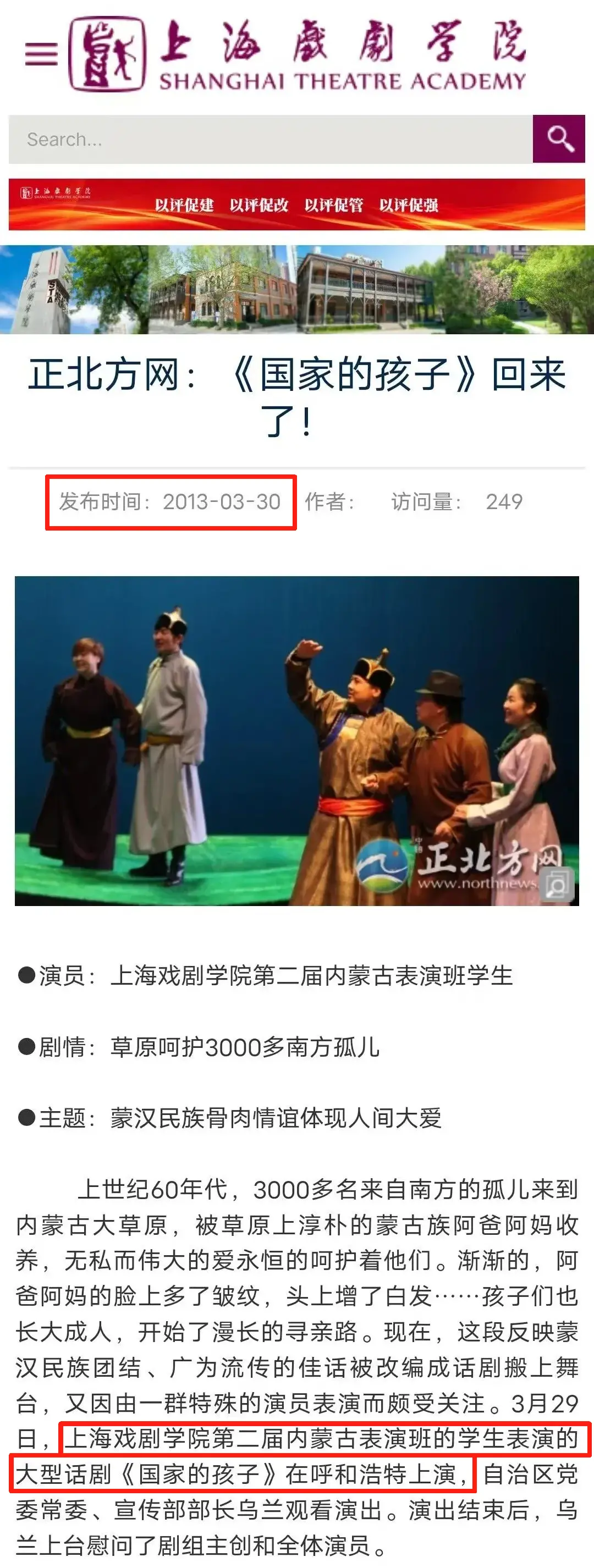 這篇報道發佈於2013年3月30日,也就是上戲08級內蒙古表演班畢業後9個月;講的主要內容是,上戲內蒙古第二屆表演班的學生回到內蒙古,表演了在當地非常有名的大型話劇《國家的孩子》。
