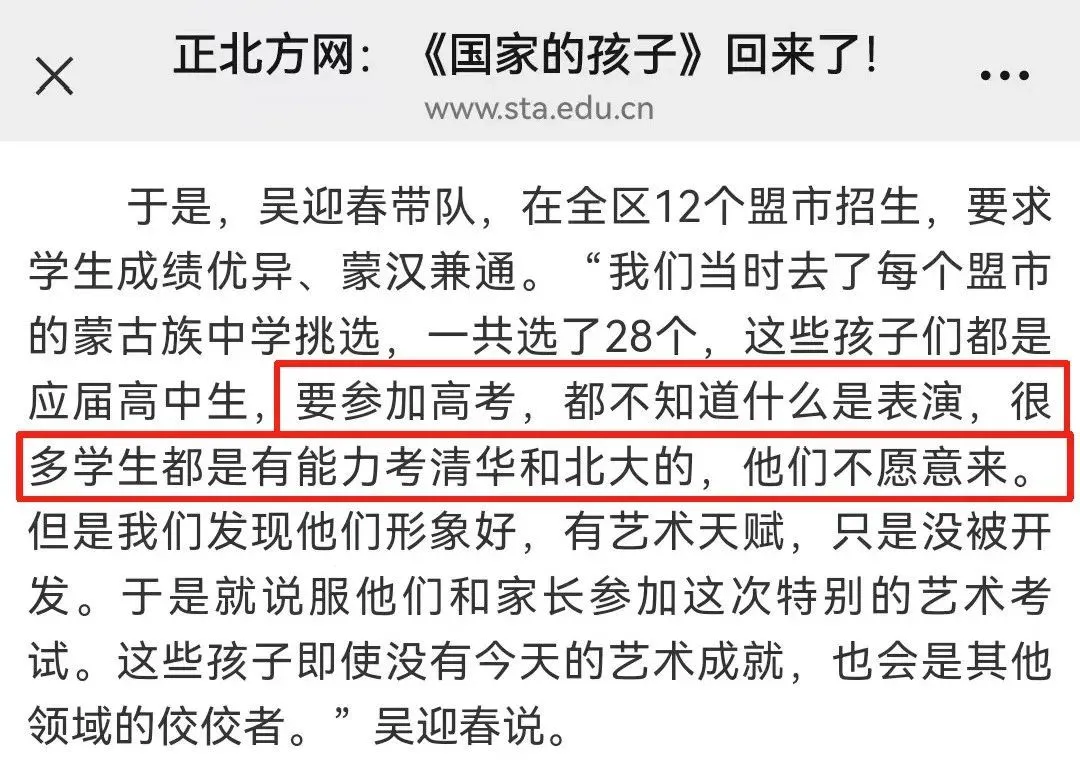 如果這個猜想太過陰暗,那麼是不是有一種可能,內蒙古確實存在藝術人才斷代問題,與其一次性達成這一個目的,不如也把那爾那茜帶上,剛好可以藏葉於林,暗度陳倉?