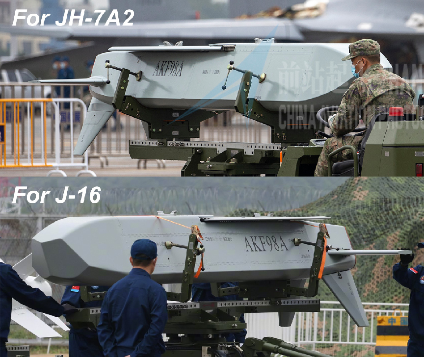 AKF-98A是解放軍新一代空地導彈,其彈體呈梯形、頭部為複雜多面體設計,具有較好的低可探測性能力,具備隱身突防能力。該彈首次亮相時曾被外界認為是空射布撒器,但很快大家發現這是一款全新的防區外空地導彈,AKF-98A戰鬥部應引入了模塊化設計,可以通過換用殺爆、集束、末敏等戰鬥部分別執行不同類型的對地打擊任務。從任務拓展性來講,AKF-98A有了長足進步,成為未來戰場空地打擊的多面手。