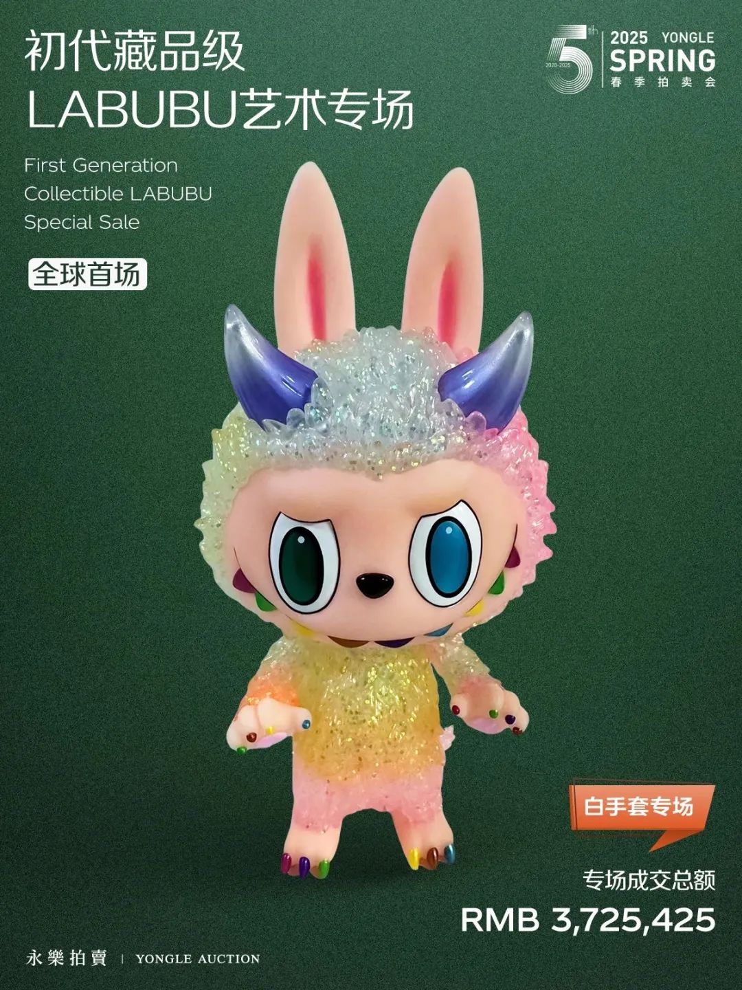 6月10日,某網絡買家在永樂拍賣平台上,用108萬拍下一隻初代薄荷色LABUBU,據永樂拍賣公告,此次LABUBU拍賣專場,48件作品全部成交,成交率高達100%,總成交額達到372.54萬元,凸顯市場對潮流藝術的強勁需求與熱烈認可。