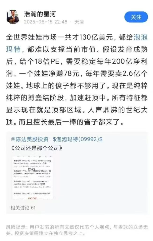 但計劃趕不上變化,僅過去9天,泡泡瑪特LABUBU熱度已經不足以支撐其較高的二手價格,6月19日下午,LABUBU價格崩盤霸榜熱搜,此前早些時候,有觀點認為LABUBU帶動的泡泡瑪特股價估值太高,泡泡瑪特當前業績無法支撐公司股價,從結果上看,6月12日泡泡瑪特股價創歷史高點後,一路下滑,目前尚無明顯止跌趨勢。