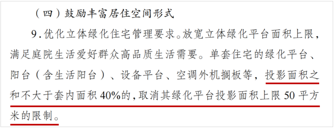 “單套住宅綠化平台、陽台等投影面積之和不大於套內面積40%的,取消其綠化平台投影面積上限50平米的限制”