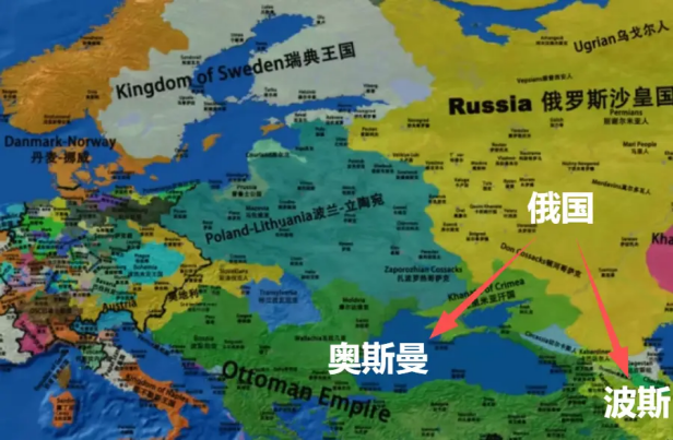 ▲俄國侵略波斯、奧斯曼帝國的圖