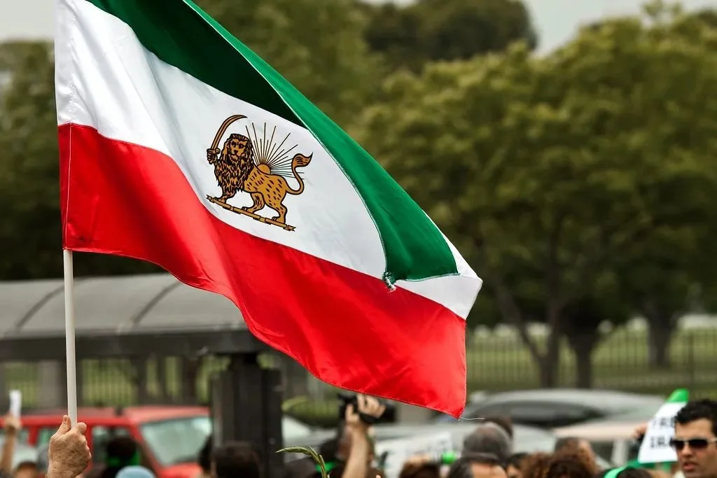▲美國伊朗裔抗爭時,手舉巴列維王朝時期的國旗