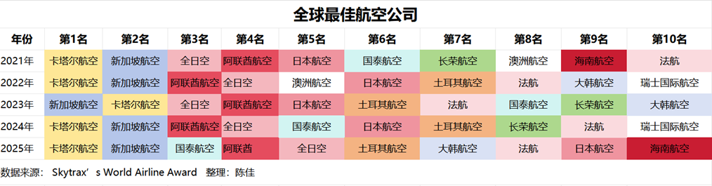 2025年前十中,卡塔爾航空、新加坡航空、國泰航空、阿聯酋航空、全日空、大韓航空、日本航空以及海南航空這八家航空公司,均來自亞洲地區。亞洲航司在Skytrax全球榜單中長期佔優,並非偶然。