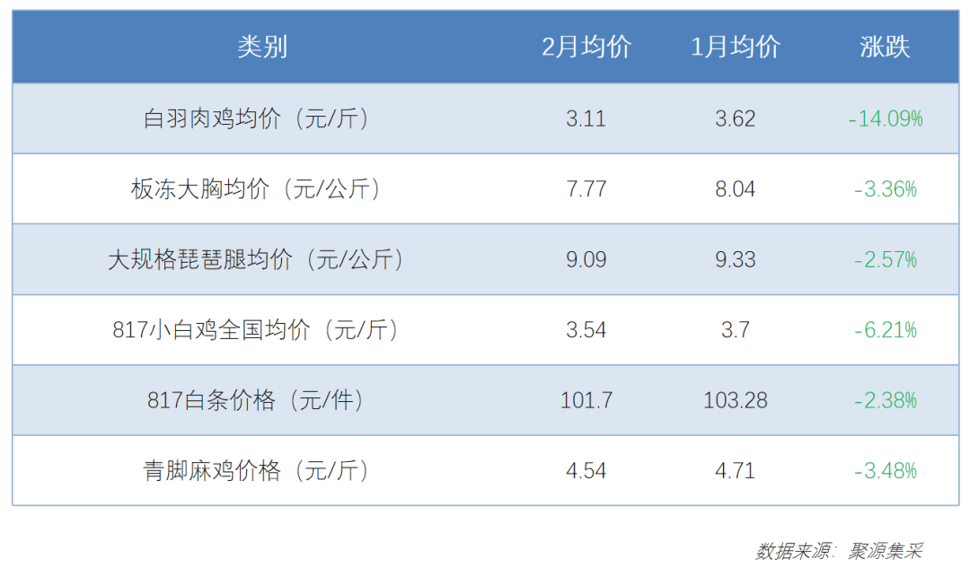 2月全國白羽肉雞價格在春節後遭遇開盤大跌,一度跌至了5年內最低點,白羽肉雞月度棚前成交均價為3.11元/斤,較上月均價下滑0.51元/斤,環比跌幅14.09%,同比跌幅21.07%。毛雞價格在春節後大幅走低,山東局部壓價甚至低至2.50元/斤以下;全國棚前成交均價在2月12日跌至2.86元/斤,為2020年後的最低點。