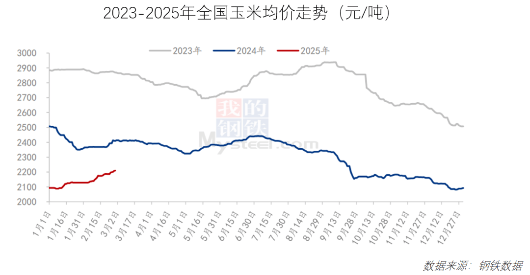 2月份國內玉米價格上漲明顯,截至2月28日,全國玉米參考價2210元/噸,較上月上漲82元/噸,環比漲幅3.85%,同比下跌8.26%。從不同地區來看,東北地區中儲糧繼續收購、深加工玉米價格節後上漲明顯。節前售糧快、節後餘糧少,農户惜售導致價格上漲。華北地區農户餘糧減少,貿易商建庫意願強、出貨意願弱,供需偏緊,市場各方對玉米價格形成較為一致的上漲預期。