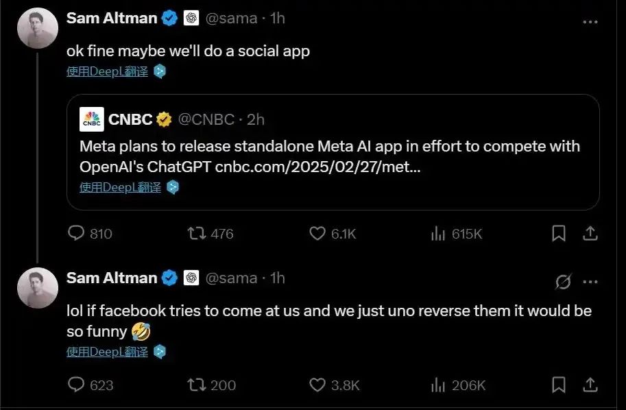 今年2月28日,CNBC報道稱,Meta旗下的AI助手Meta AI即將成為該社交媒體公司的獨立應用,目標直指OpenAI和谷歌母公司Alphabet等競爭對手。對此,OpenAI奧特曼回應道:“要不我們去做一款社交APP?”並在社交媒體的評論區寫道,“如果Facebook想找我們麻煩,我們直接‘反殺’他們,那場面一定超搞笑。”