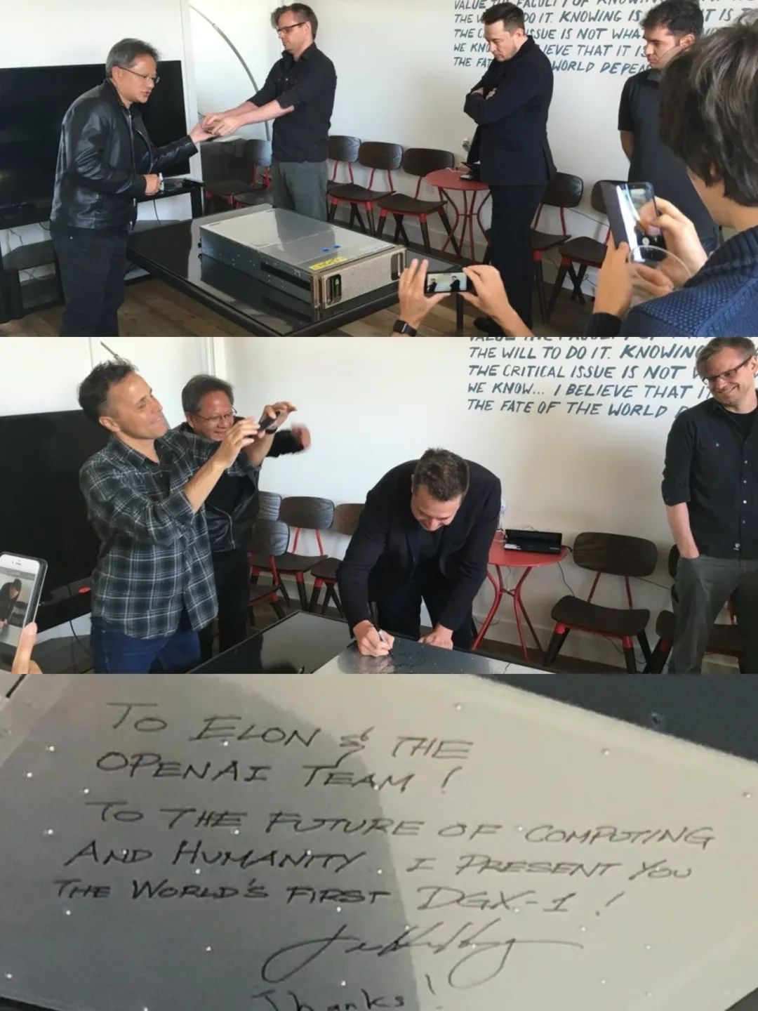 9年前,黃仁勳第一次向OpenAI贈送全球第一台DGX-1超級計算機的時候,留言“To ELON &THE OPENAI TEAM!”,絲毫未提及奧特曼的名字。在那場大佬會面留下的照片資料裏,也不見奧特曼的身影。