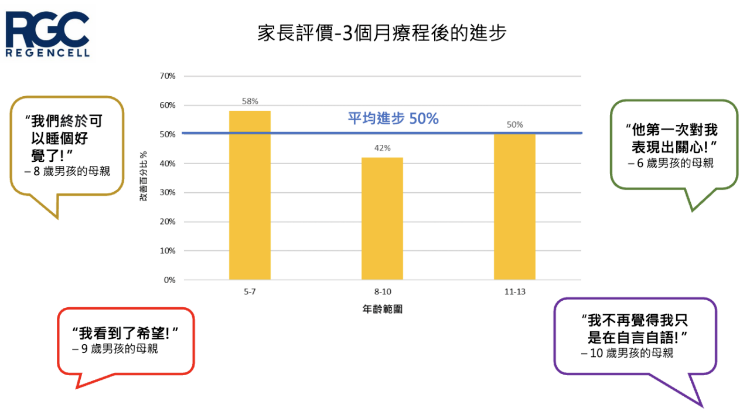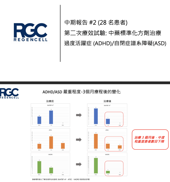經過3個月的治療,使用其標準化中藥配方後,患者的ADHD/ASD症狀嚴重程度(根據SKATBT-A3, ATEC, VADRS量表評估)有所降低;父母對子女整體改善的印象非常積極(報告稱平均改善百分比為50%)。