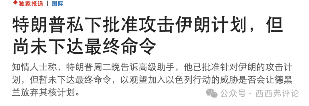 根據華爾街日報報道,美國總統特朗普週二晚間告訴高級助手,他已批准針對伊朗的攻擊計劃,但暫未下達最終命令,以觀望德黑蘭是否會放棄其核計劃。最新的新聞説特朗普會在兩週內決定是否攻擊伊朗。