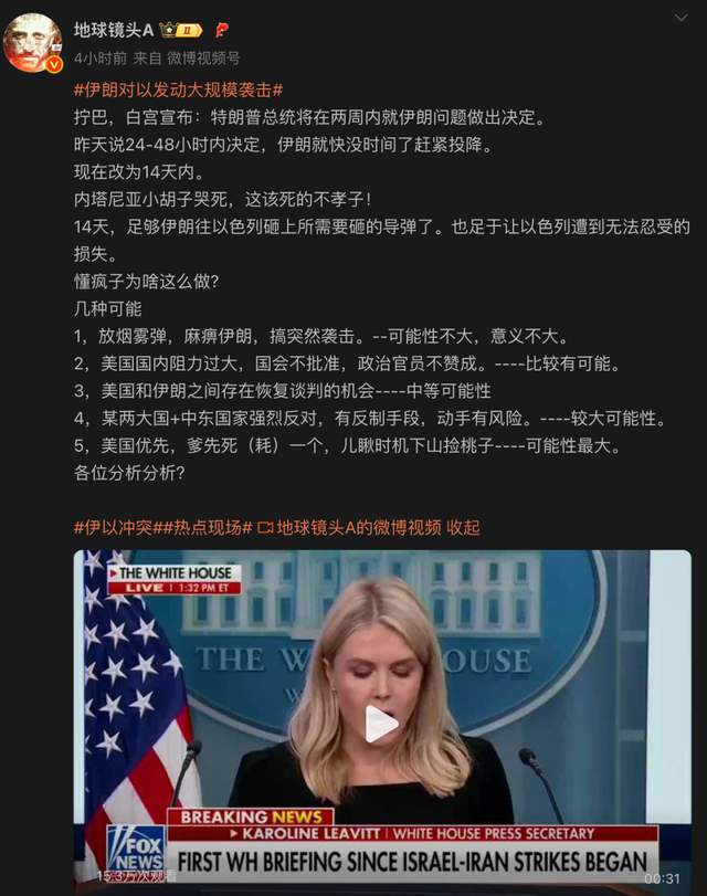 美國媒體此前報道,特朗普已經批准了對伊朗的作戰計劃,但還沒有最終下令。此前美媒體報道美國將在24到48小時內決定是否介入,然後就是一週內決定,現在白宮已經宣佈將在2週年決定。
