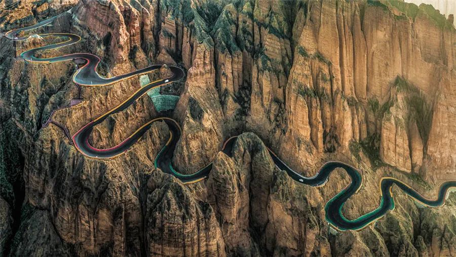 ▲黃河石林二十二道彎,全長2.3公里,落差最高達216米,共有22道彎。此盤山公路由甘肅省景泰縣當地政府修建,連接景區入口與山下龍灣村。****