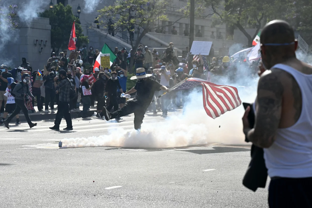 ▲2025年6月,在洛杉磯舉行的“不要國王”集會上,抗議者踢飛一枚催淚彈,警方試圖驅散示威人羣