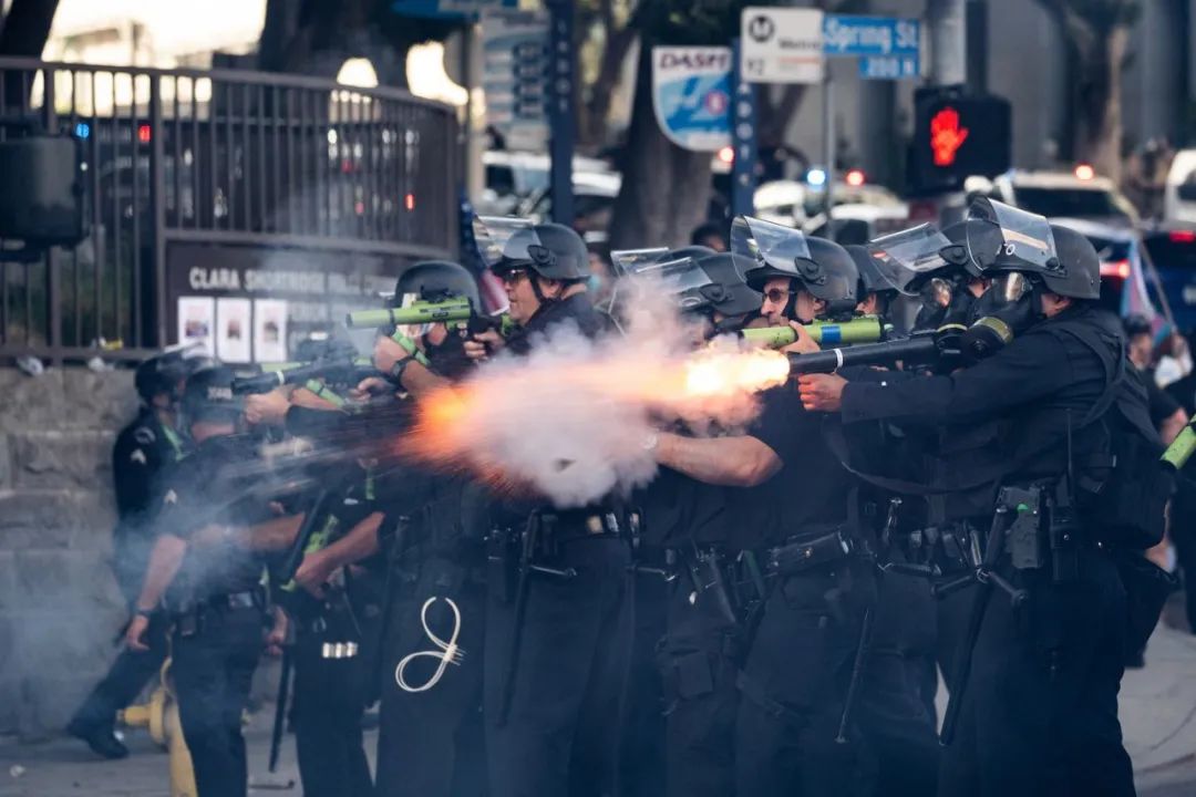 ▲2025年6月,洛杉磯警方在洛杉磯市中心向抗議者發射非致命彈藥和催淚瓦斯