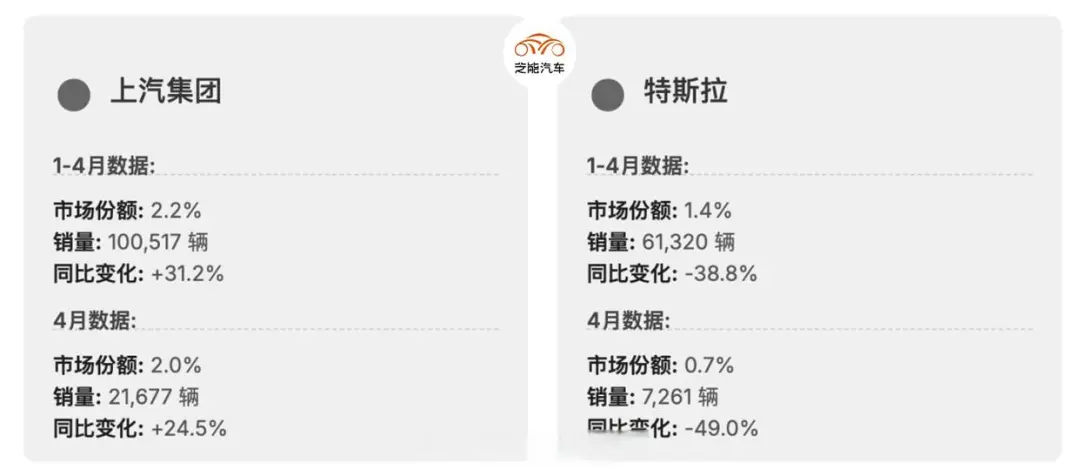 圖/2025年1-4月上汽與特斯拉銷售數據