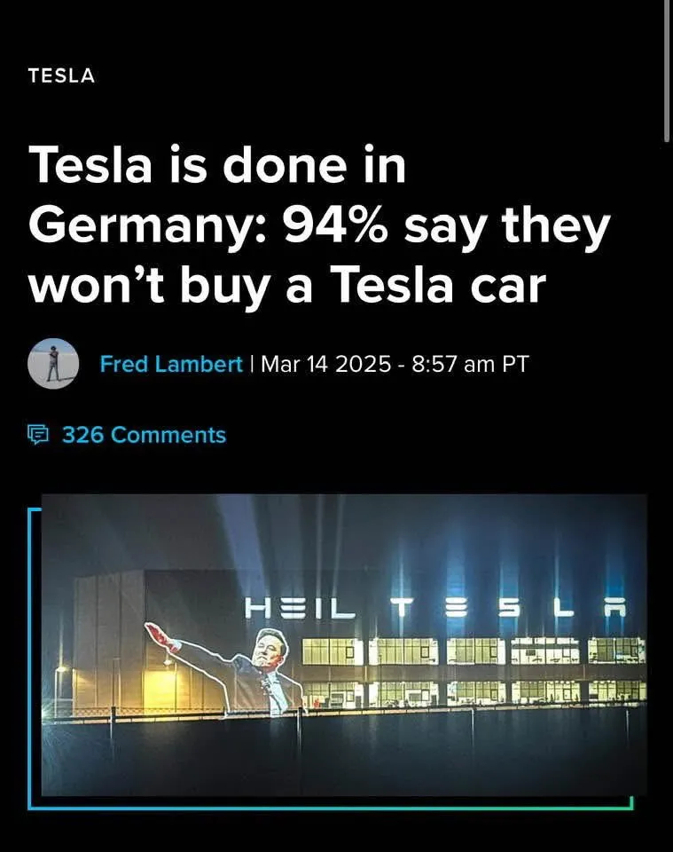 例如他對德國右翼政黨的公開吹捧,激怒了從工會到政界的整個主流社會。德國人憤怒地叫囂再也不買特斯拉。當品牌從“環保先鋒”淪為“極右符號”,銷量崩塌已成定局。