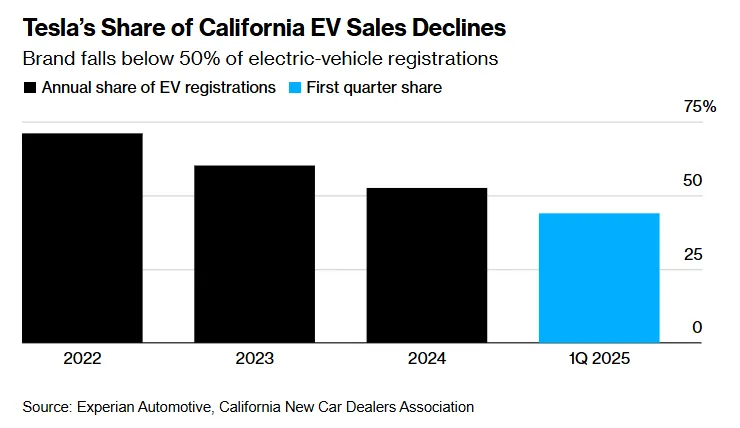 2025年第一季度,特斯拉在當地電動車市場份額驟降至43.9%,自2012年以來首次跌破50%警戒線。更諷刺的是,當加州電動車整體銷量增長35%時,特斯拉的註冊量卻逆勢下滑15%。