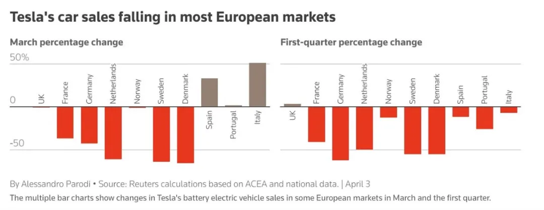 在法國、荷蘭、挪威、丹麥等國特斯拉銷量降幅均超60%——跌幅之大,讓媒體標題集體換上“斷崖式”“腰斬”等觸目詞藻。