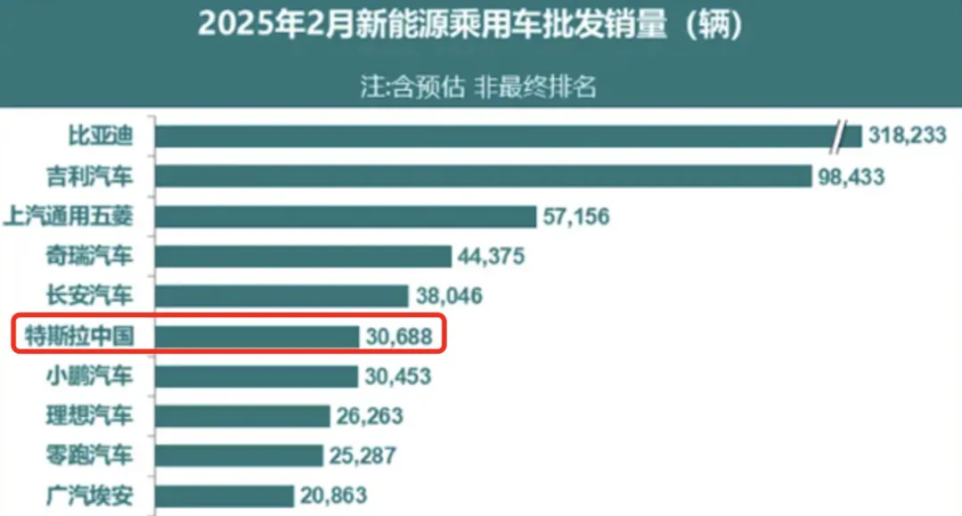 2025年2月,特斯拉批發銷量僅30688輛,同比暴跌49.16%,直接跌出新能源銷量前十。曾經封神的Model Y,市場份額從7.8%縮水至5.4%,淪為二線玩家。