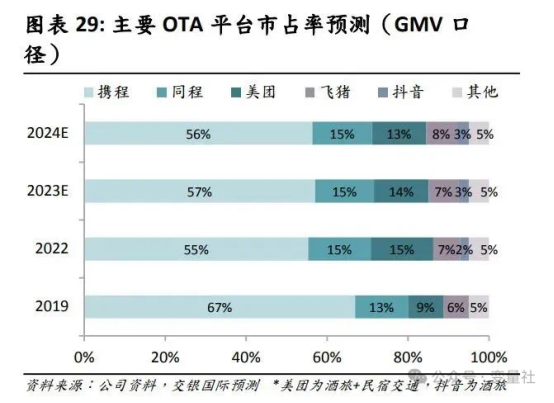 如今市面上的傳統OTA平台中,攜程市場份額遙遙領先,去哪兒、同程、藝龍等也基本劃為攜程集團旗下,把持着市場話語權,就連背靠阿里生態的飛豬、手握巨大流量的抖音,也未能佔得便宜,面臨着市場份額下降的困局。