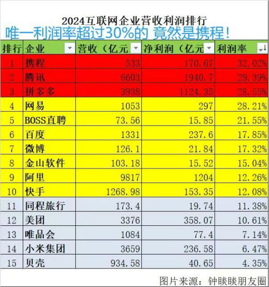 目前絕大多數的互聯網企業,即使營收規模再大,但在利潤率上,甚至連攜程的零頭都趕不上。