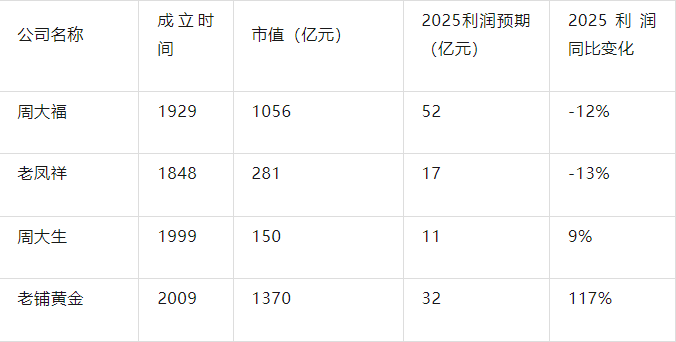 而老品牌們還深陷在高金價中。作為成立最晚的品牌,市場一致預期老鋪黃金2025年利潤將翻倍,其他品牌則是面臨着不小的下滑壓力。老鋪黃金的最新市值接近1400億元,這個最新品牌反超百年老店登頂黃金珠寶行業市值第一。