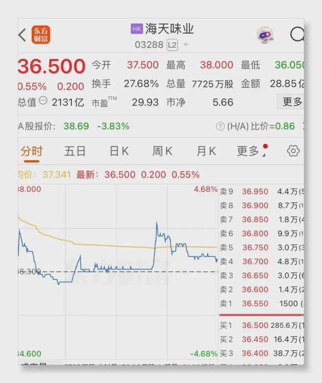 6月19日,調味品行業的巨擘海天味業正式登陸港股,這場上市之旅備受矚目,宛如一場商業領域的盛事,吸引了無數投資者與行業觀察者的目光。當日,海天味業以37.5港元/股的價格開盤,較發行價36.3港元上漲3.3% ,一時間,市場歡呼雀躍,投資者們似乎看到了新一輪財富增長的曙光。然而,市場的風雲變幻總是讓人始料未及,隨後股價迅速回落,盤中一度跌破發行價,宛如過山車般的走勢,讓投資者們的心情也隨之跌宕起伏。截至收盤,海天味業港股股價定格在36.5港元,微漲0.55%,總市值2131億港元;同期A股股價卻下跌3.83%,這樣的市場表現,無疑為海天味業的港股上市首日增添了幾分戲劇性色彩。