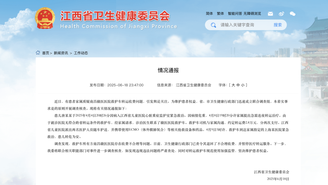 事件報道後發,6月18日23時47分,江西省衞生健康委員會官網就“救護車跨省轉運收費2.8萬”一事發布通報,通報稱: