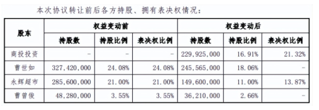 曹世如、曹曾俊及永輝超市與商投投資簽署了《股份轉讓協議》,約定三者將其合計持有的紅旗連鎖2.3億股(佔紅旗連鎖總股本的16.91%),以協議轉讓的方式轉讓給四川商投集團旗下商投投資,轉讓價格5.88元/股,金額合計達13.52億元。