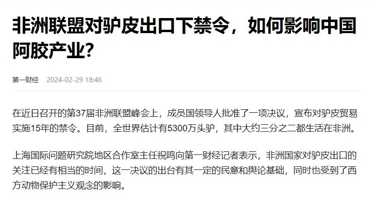 為了彌補製作阿膠對驢皮的大量需求,進口驢皮就成為不得不的選擇。據華西證券研報顯示,目前國內外驢皮採購佔比基本持平。但出於保護考慮,不少國家開始對驢皮貿易和活驢宰殺進行限制。去年就有消息傳出,非洲聯盟通過了一項針對驢皮貿易的動議,決定對非盟成員國的驢皮出口實施15年的禁令。