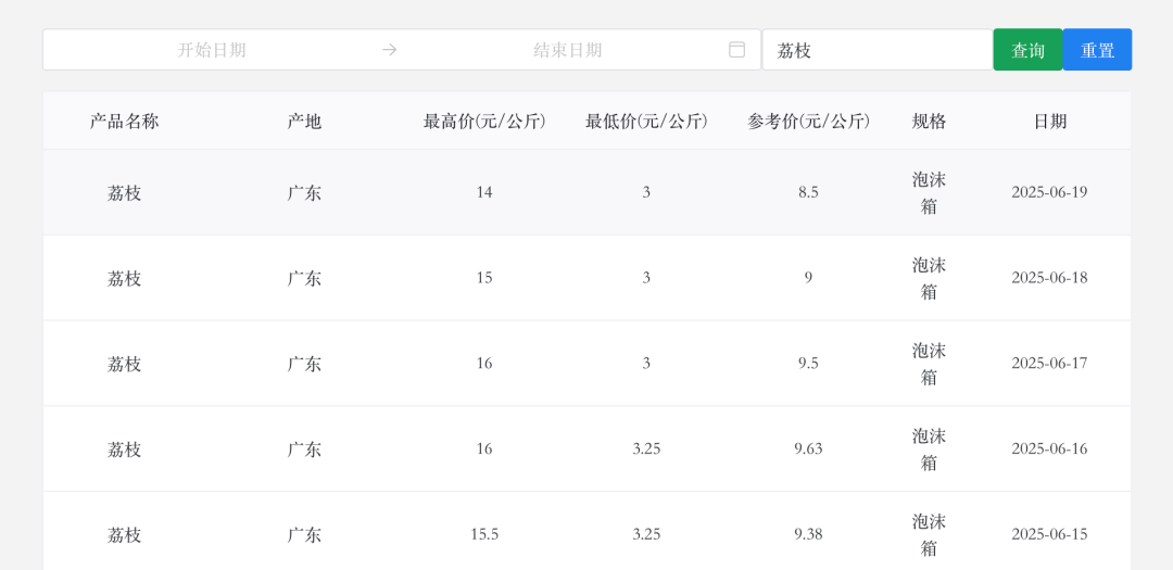 廣州江南果蔬批發市場數據顯示,截至6月18日,廣東所產荔枝參考售價為8.5元/公斤,最高價14元/公斤,最低價3元/公斤。而在5月23日,廣東、海南、廣西荔枝參考售價為12.75元/公斤,最高價16.5元/公斤,最低價9元/公斤。