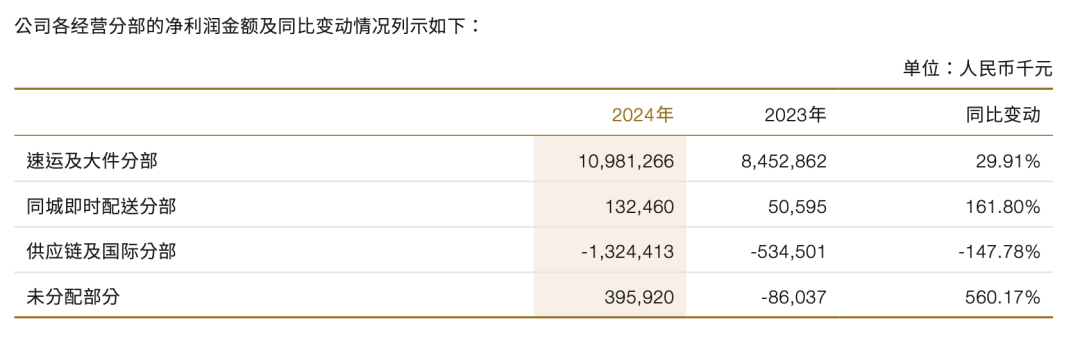2024年,順豐速運及大件分部淨利潤為109.81億元,同期增長29.91%;同城即時配送分部2024年淨利潤約為1.32億元,較2023年同期增長161.80%;供應鏈及國際分部2024年淨虧損約13.24億元。