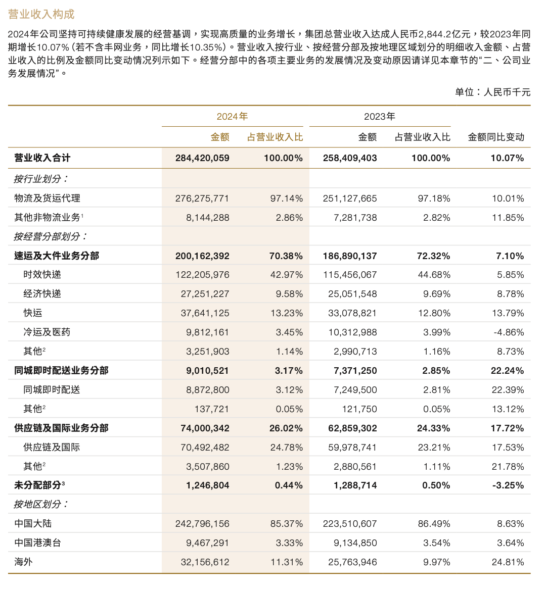 同時,順豐速運及大件分部2024年的增速僅為7.1%,當中佔大頭的時效快遞增速也只有5.85%,經濟快遞的增長也是個位數。可以説,在核心業務增長遇到瓶頸的情況下,經濟快遞、冷運及醫藥、同城即時配送等業務需要更快成為順豐的業績增長點。