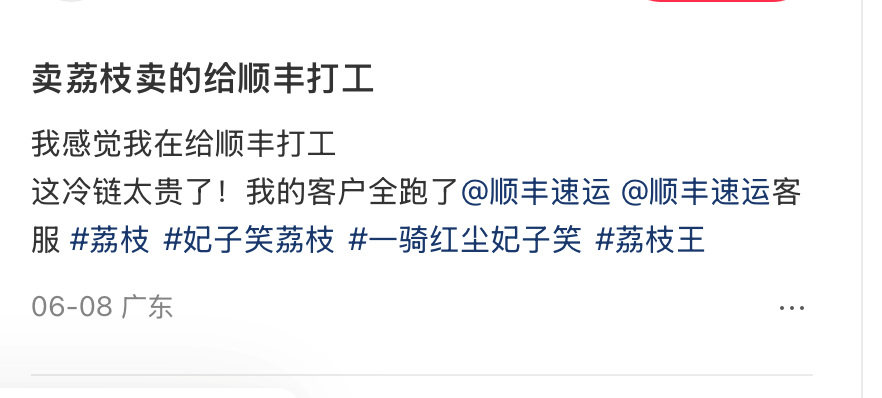 而在社交平台上,也有不少銷售荔枝的果農發帖,稱快遞費用過高,自己在“給順豐打工”。