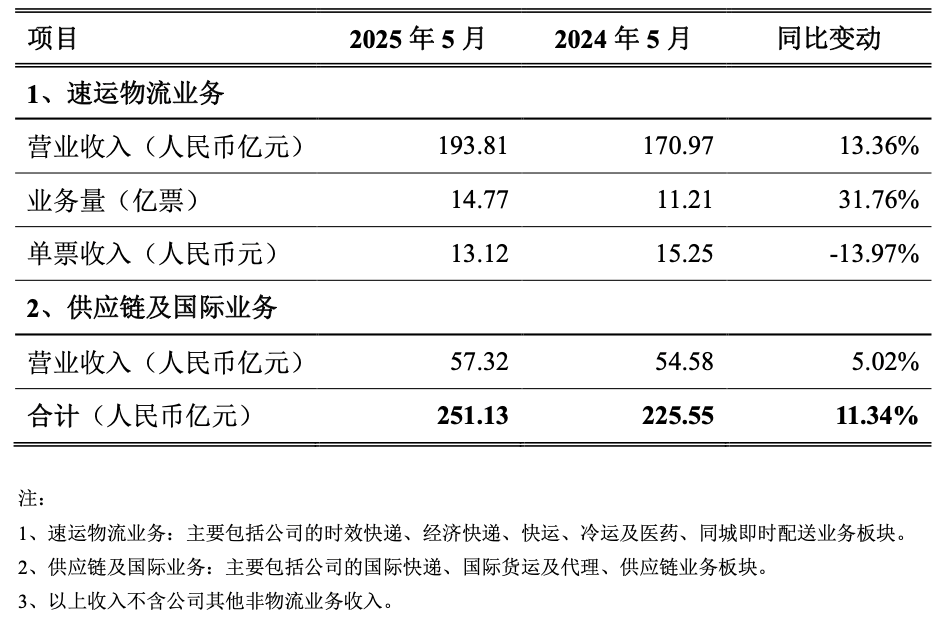 另據6月19日順豐披露的2025年5月快遞物流業務經營簡報,速運物流業務、供應鏈及國際業務合計收入為251.13億元,同比增長11.34%。其中,速運物流業務收入同比增長13.36%,業務量同比增長31.76%;供應鏈及國際業務收入同比增長5.02%。
