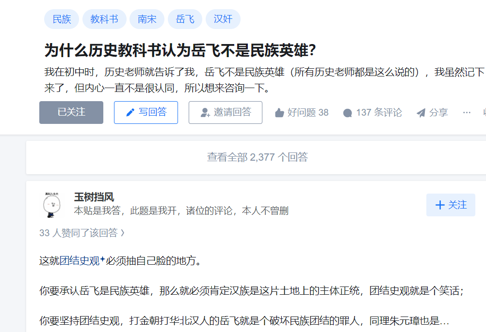所以,關於岳飛的評價問題,應該結合當時歷史背景,當時歷史條件下,岳飛對抗北方金國軍隊南下,當然具有合理性,當然是民族英雄。但是當今中華民族,是包括漢族和北方所有遊牧民族,甚至後來的漢族本身,就已經融合了南下的北方遊牧民族,漢族概念本身就已經發生了巨大變化。