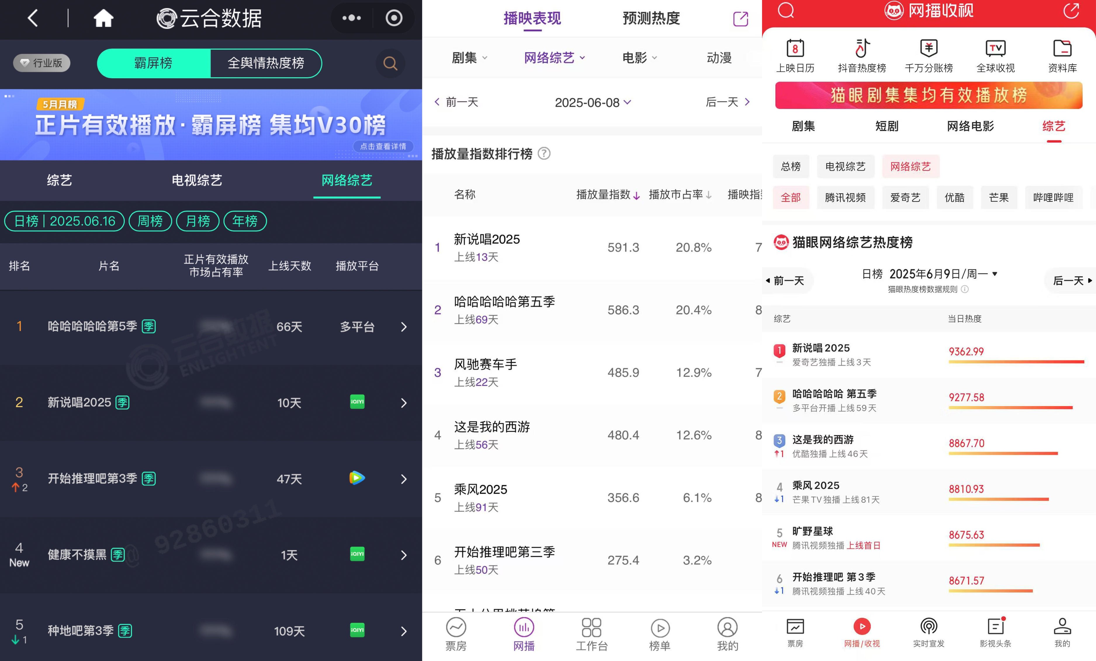 在雲合網綜霸屏榜TOP5中,愛奇藝綜藝更是一度佔據四席。其中,《五哈5》《新説唱2025》立大功,聯手包攬各大數據榜單TOP1,後者首播更以9531的熱度刷新系列IP熱度最高值。