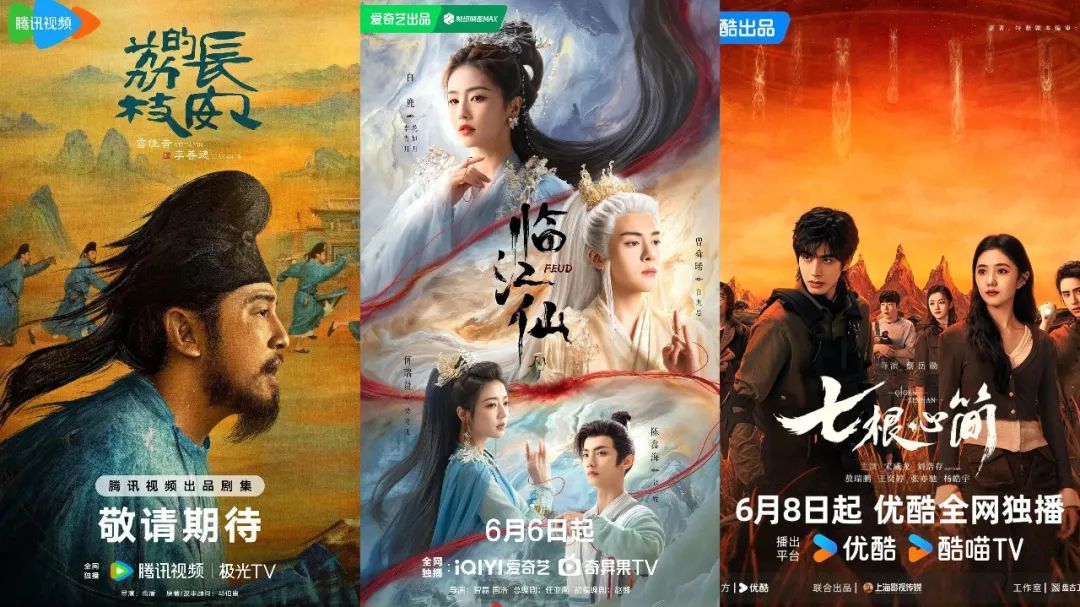 **劇集領域,仙俠、歷史、奇幻等多熱門題材齊入場,拉動平台流量和關注度。**愛奇藝推出了“離婚仙俠”《臨江仙》,攜手歡娛影視打造極致愛恨的新仙俠,騰訊視頻、優酷分別拿出來IP改編劇《長安的荔枝》和《七根心簡》接招。雲合數據顯示,進入6月份以來,愛奇藝劇集正片有效播放高達30.95%,位列視頻平台之首,騰訊、優酷緊隨其後,三家共同構建了暑期檔的強勢劇集矩陣。