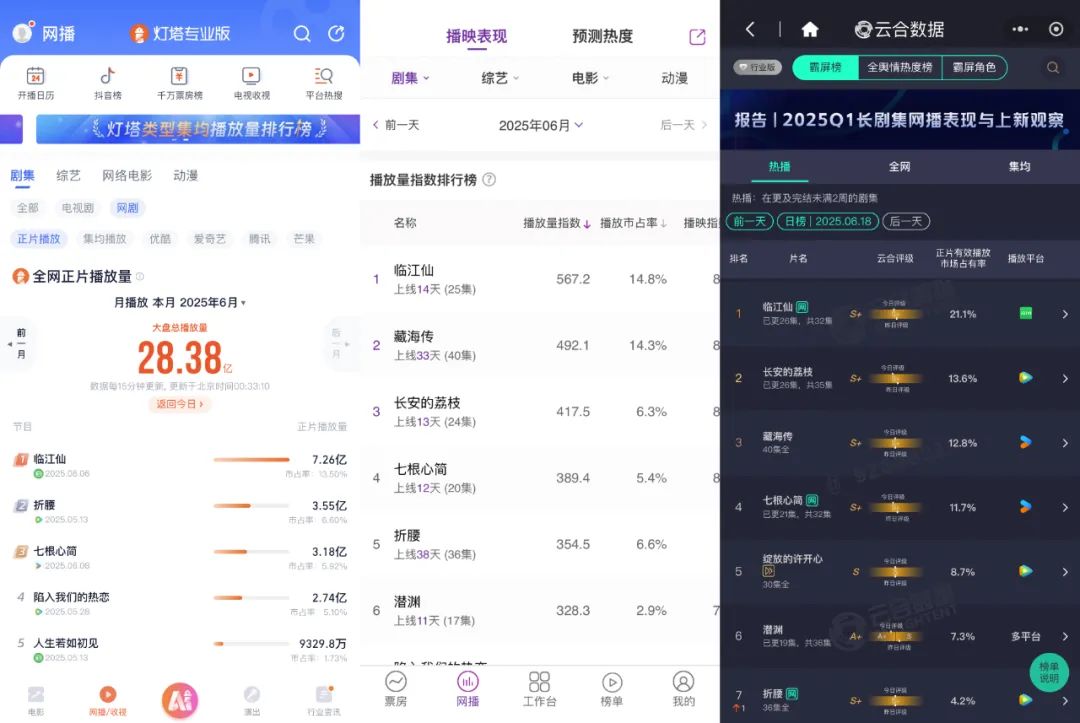 從單項目來看,《臨江仙》以雲合市佔率超24%、vlinkage網播指數上漲至88.51,力壓同期劇集,跑出了斷層領先的勢頭。這部劇不僅快速在愛奇藝內容熱度破萬解鎖“爆款認證”,還成功登頂燈塔6月、藝恩6月、雲合、貓眼、骨朵、德塔文、Vlinkage等多榜TOP1。騰訊視頻《長安的荔枝》和優酷《七根心簡》,在開播前就因馬伯庸和尾魚“IP宇宙”而備受關注,《藏海傳》也憑藉長尾效應躋身前列,三部劇雲合市佔率維持在10%-15%之間。