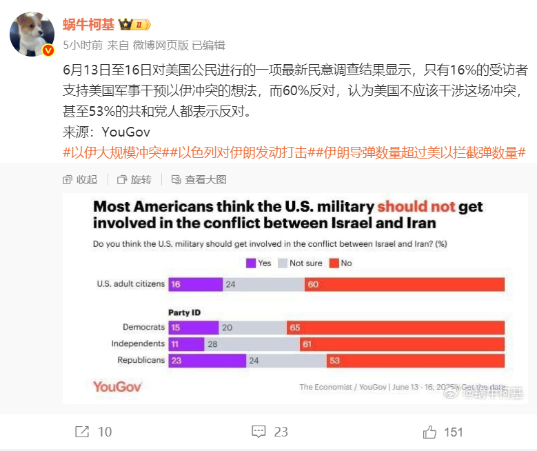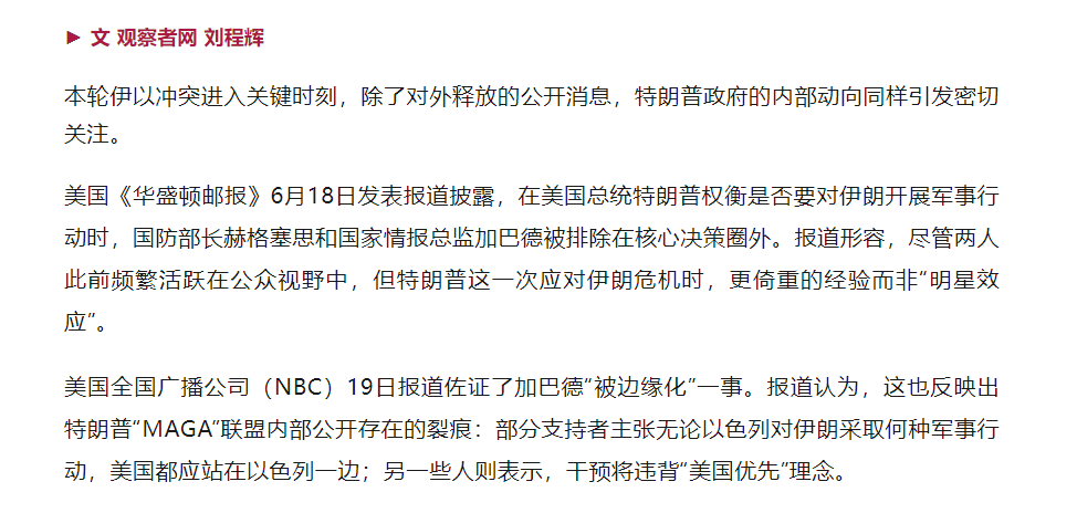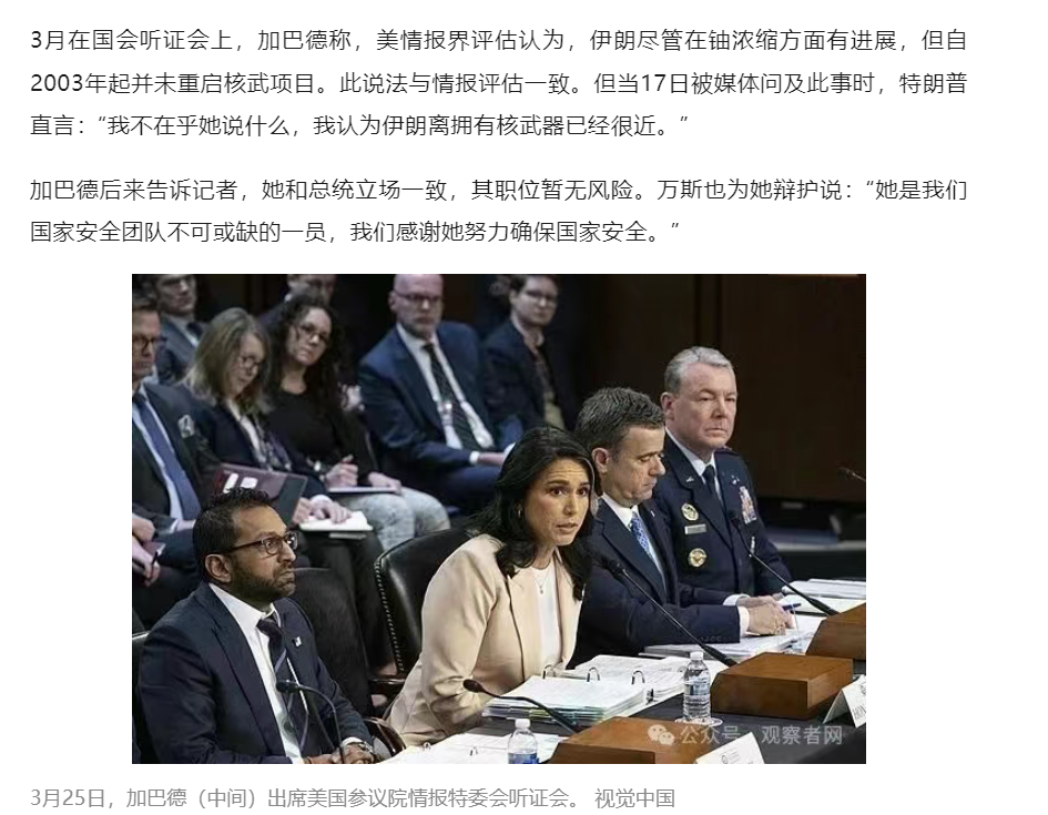 當然,類似的事件也並非以色列的獨家。比如説就在最近,美國國家情報總監圖爾西加巴德就公開表示,沒有證據表明伊朗在推進核武器計劃,但是特朗普表示他不在乎。以特朗普的個性,他對伊朗打擊的決心有多少很難説,但是他想利用伊朗事件給自己爭取聲望,讓自己不再被稱為“TACO”之類的,卻是十分明顯。