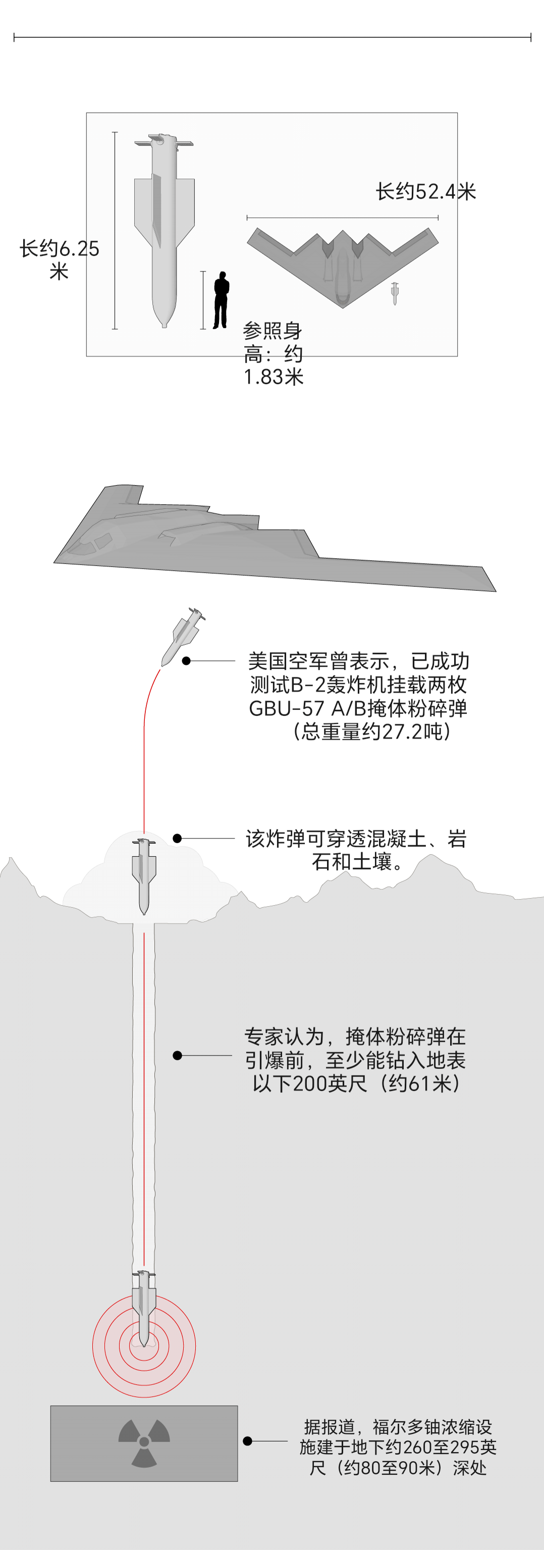 譯者注:五角大樓的評估認為,想要有效打擊福爾多核設施,至少需要動用兩枚MOP炸彈,以一前一後的方式“接力”實現連環穿透才有可能。華盛頓國防大學近東和南亞戰略研究中心的高級軍事研究員大衞·德羅什分析稱,轟炸機必須在“完全相同的位置投下兩枚鑽地彈”,即同一個地點精確命中兩次,才可能穿透防禦層,這本身就極具挑戰。圖源:紅星新聞