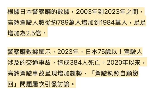 在大都市,這樣的駕駛年齡有多大風險?數據會説話,2023年,全日本75歲以上的高齡司機,共造成384人死亡,相比而言,槍擊死亡只有個位數。高齡駕駛顯然猛於犯罪分子。