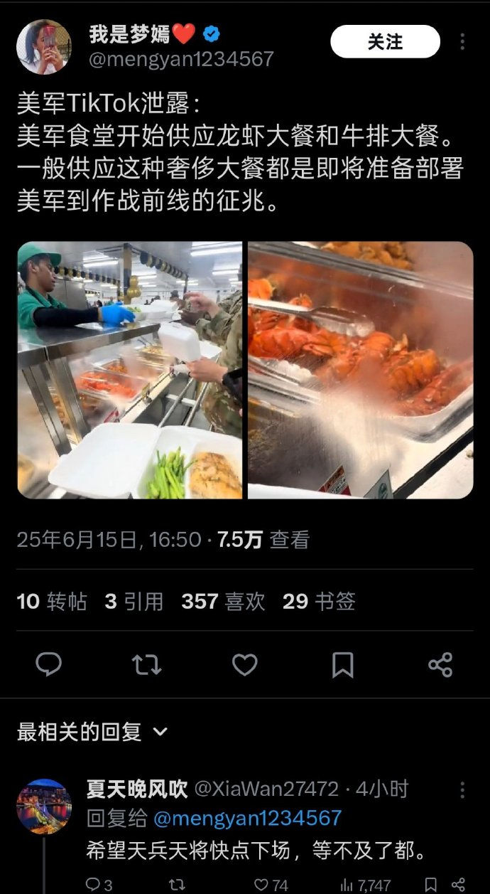 美國空軍向中東軍事基地實施大規模集結,美國海軍調動兩個航母打擊羣急速趕赴中東,甚至連中東美軍基地的大頭兵都開始曬龍蝦牛排這種“出征飯”。