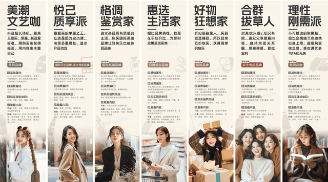 在抖音做生意的都知道“八大人羣”概念,主要是基於性別、年齡、城市等級、消費能力、職業、人生階段等維度對主流人羣打上標籤。然而,在美妝行業的高度成熟和激烈競爭下,八大人羣這種人口社會屬性的基礎標籤已經無法完全支持品牌人羣精細化洞察和運營的需求了。比如,防曬、面霜、精華這三個品類的核心人羣基本都集中在“精緻媽媽”和“資深中產”,但不同品類下看不到人羣差異,而且當多品牌、多品類都在以這兩大人羣為目標時,不僅滲透空間有限,在粗放競爭中也很難提效。