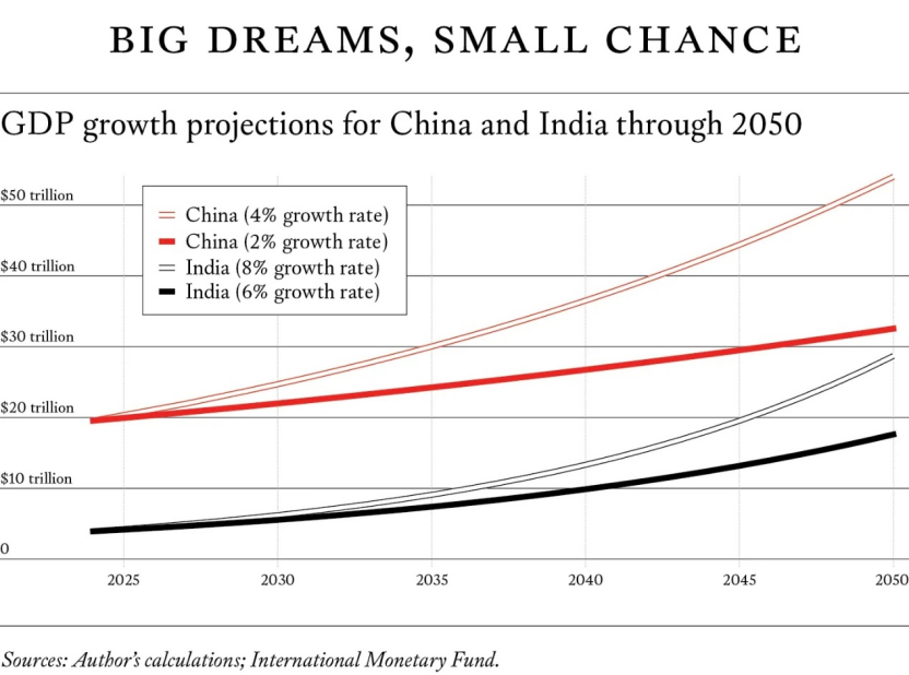 因此,根據世界銀行截至2023年的數據,印度未來二十年的年均增長率很可能達到6%,與過去十年的平均年增長率持平。如果這種情況真的發生,而中國年均增長率僅為2%,那麼新德里相對於北京的地位肯定會有所提升:到本世紀中葉,印度的GDP將略高於中國的一半。但未來幾十年,中國仍有可能實現年均GDP增長率超過2%。儘管面臨諸多挑戰,但中國相對於印度仍然擁有巨大的經濟優勢,包括受過良好教育、技術熟練且相對健康的人口;更高的技術水平;以及更大的資本存量。中國在人工智能、機器人、能源存儲以及信息通信等關鍵技術領域進行了大量投資,儘管存在人口結構限制,但這些投資仍有可能促進經濟增長。如果中國經濟增長速度再快一點,比如説每年3%,那麼即使印度的增長率為6%,中國最終的經濟規模也可能接近印度的三倍。