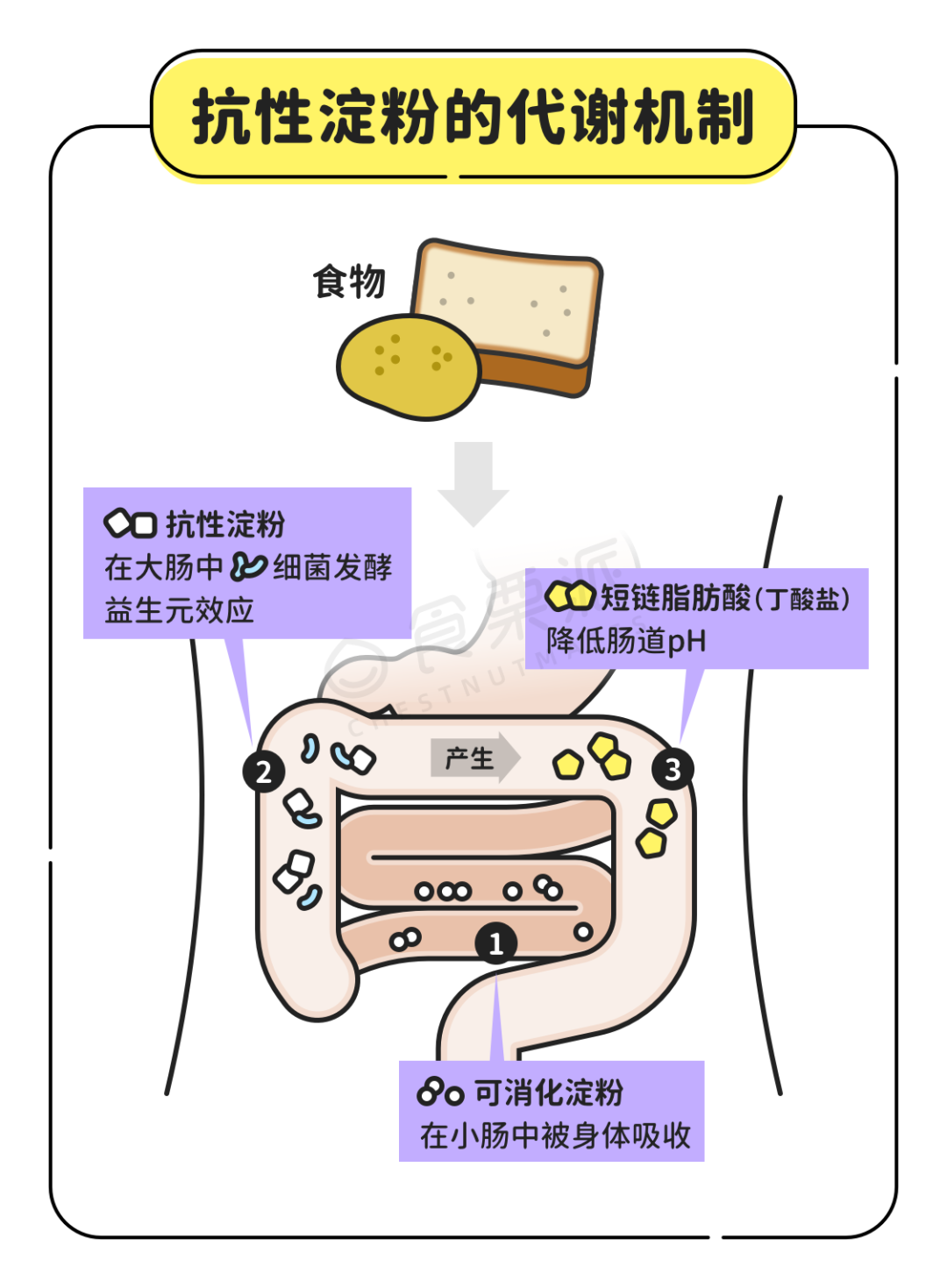 前兩種都能被完全消化,而抗性澱粉不能被消化,所以幾乎不產生能量;但是達到結腸後會被結腸中的微生物發酵,繼而發揮有益的生理作用,因此被看作是膳食纖維的組成成分之一。