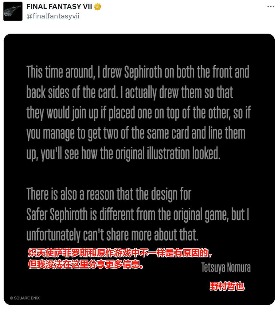 不久前,《最終幻想7》重製版經歷了一次“劇情偷跑”——玩家們發現一張由遊戲總監和美術負責人野村哲也親自繪製的薩菲羅斯卡牌,上面的薩菲羅斯和《最終幻想7》重製版裏沒有右手的設定不符。