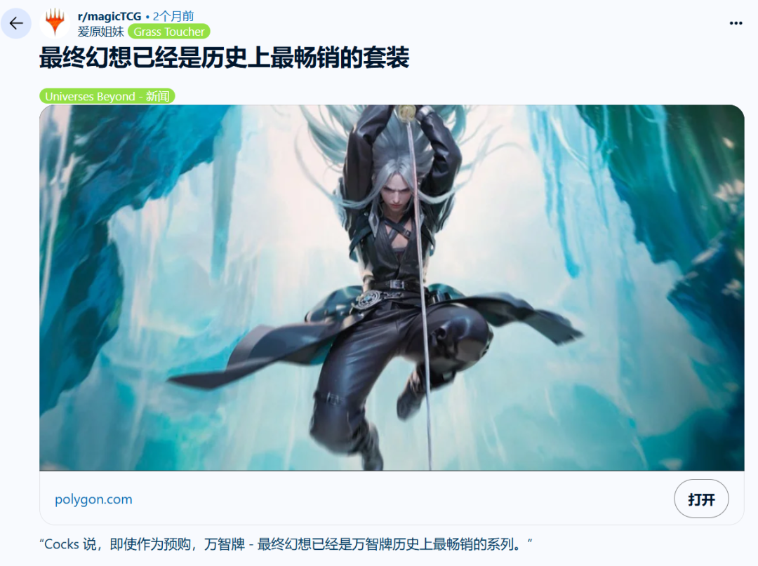 這種充滿巧思和彩蛋的誠意,不僅讓萬智牌和《最終幻想》“雙廚”玩家會心一笑,也吸引了挺多原本不玩萬智牌的玩家駐足。在4月的投資者電話會議上,孩之寶的CEO透露,《最終幻想》聯動系列僅憑預售成績,就已經是萬智牌歷史上銷售速度最快的系列。